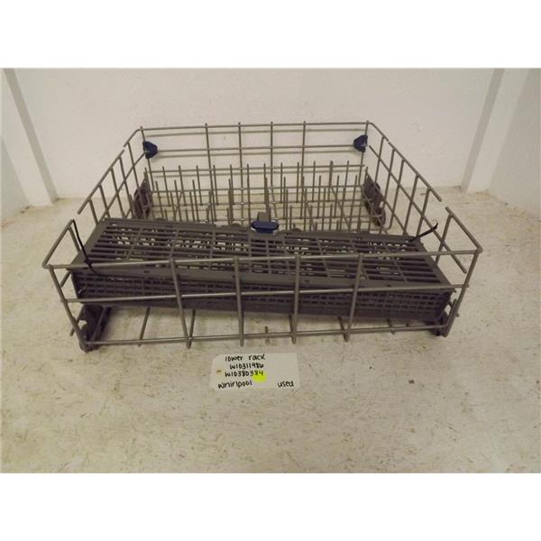 Used Whirlpool lower dishwasher rack in good condition. May contain small amounts of rust and/or chips.