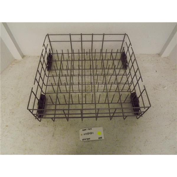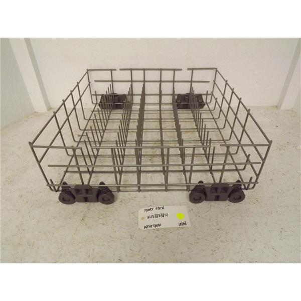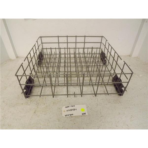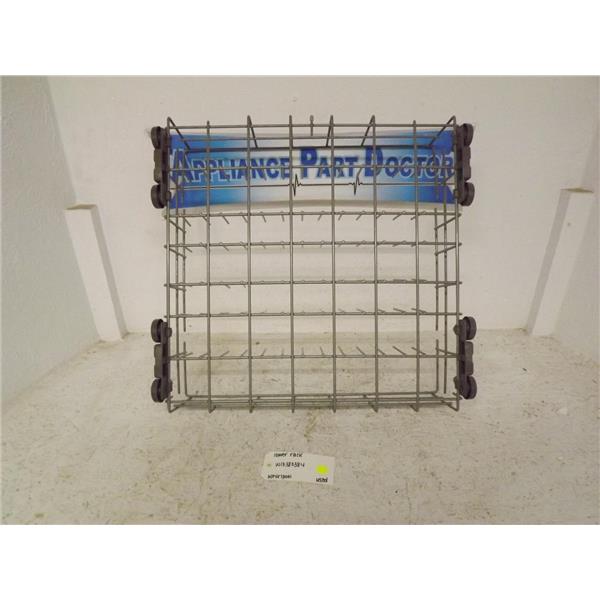 Used Whirlpool lower dishwasher rack in good condition. May contain small amounts of rust and/or chips.
